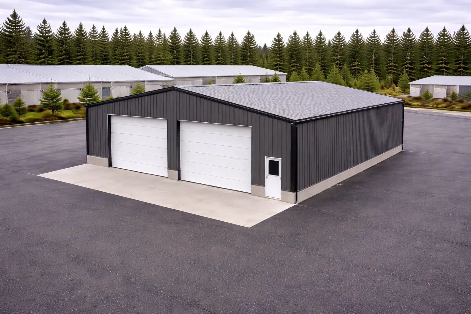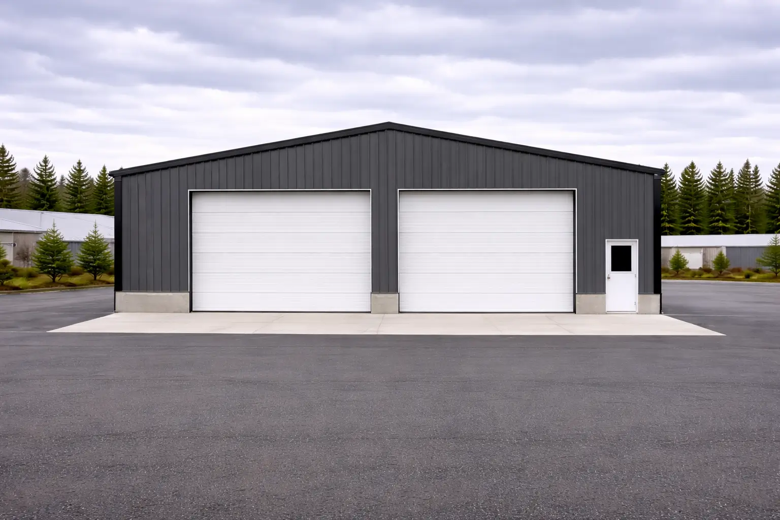 The rigid-frame clear-span system eliminates interior columns, enabling uninterrupted vehicle servicing space and flexible equipment placement.