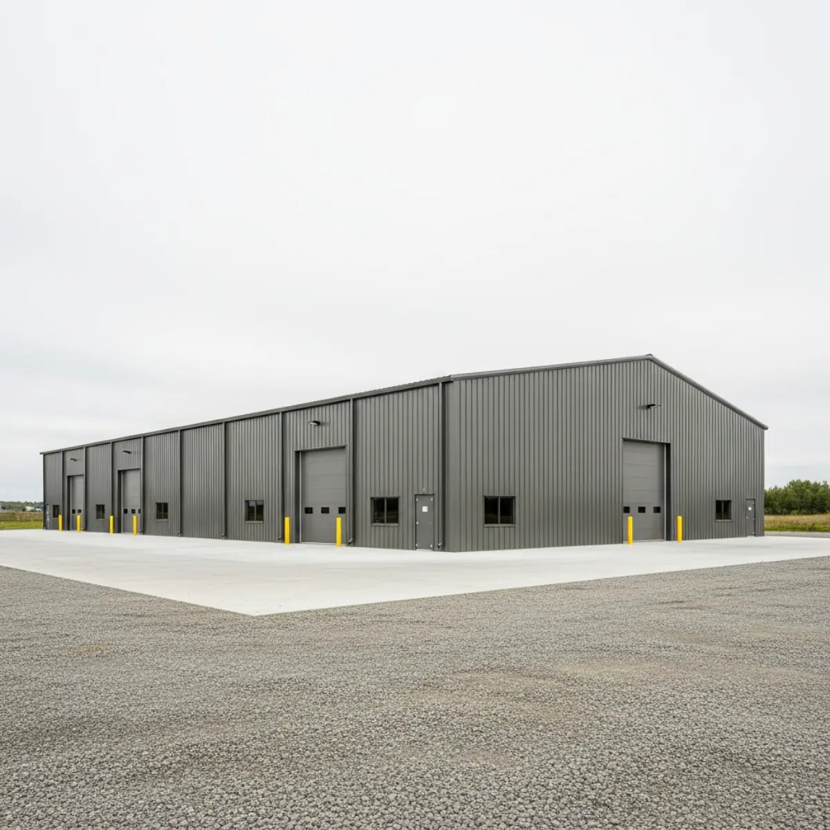 This prefab metal commercial building is frequently evaluated for equipment housing, commercial storage, service operations, and structured business activity across Canadian properties requiring expanded clear-span interior space.